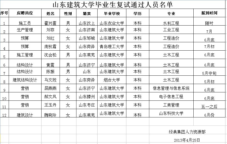 山東建筑大學2013年4月23日復試通過人員名單